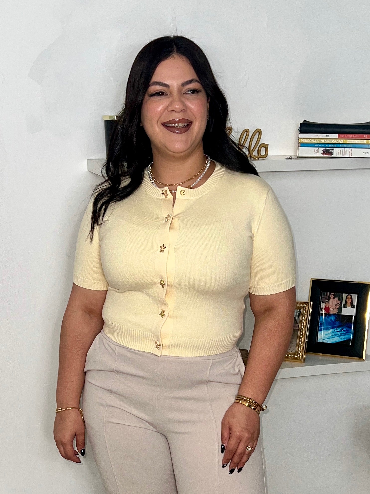 Express your daring style with the Ariel Cardigan. This butter yellow crop cardigan features snap buttons adorned with a star or moon, adding a touch of boldness to your wardrobe. Perfect for any adventure, it's designed with 3/4 sleeves for ease of movement. Go ahead, snap it up and show off your fearless fashion sense!
