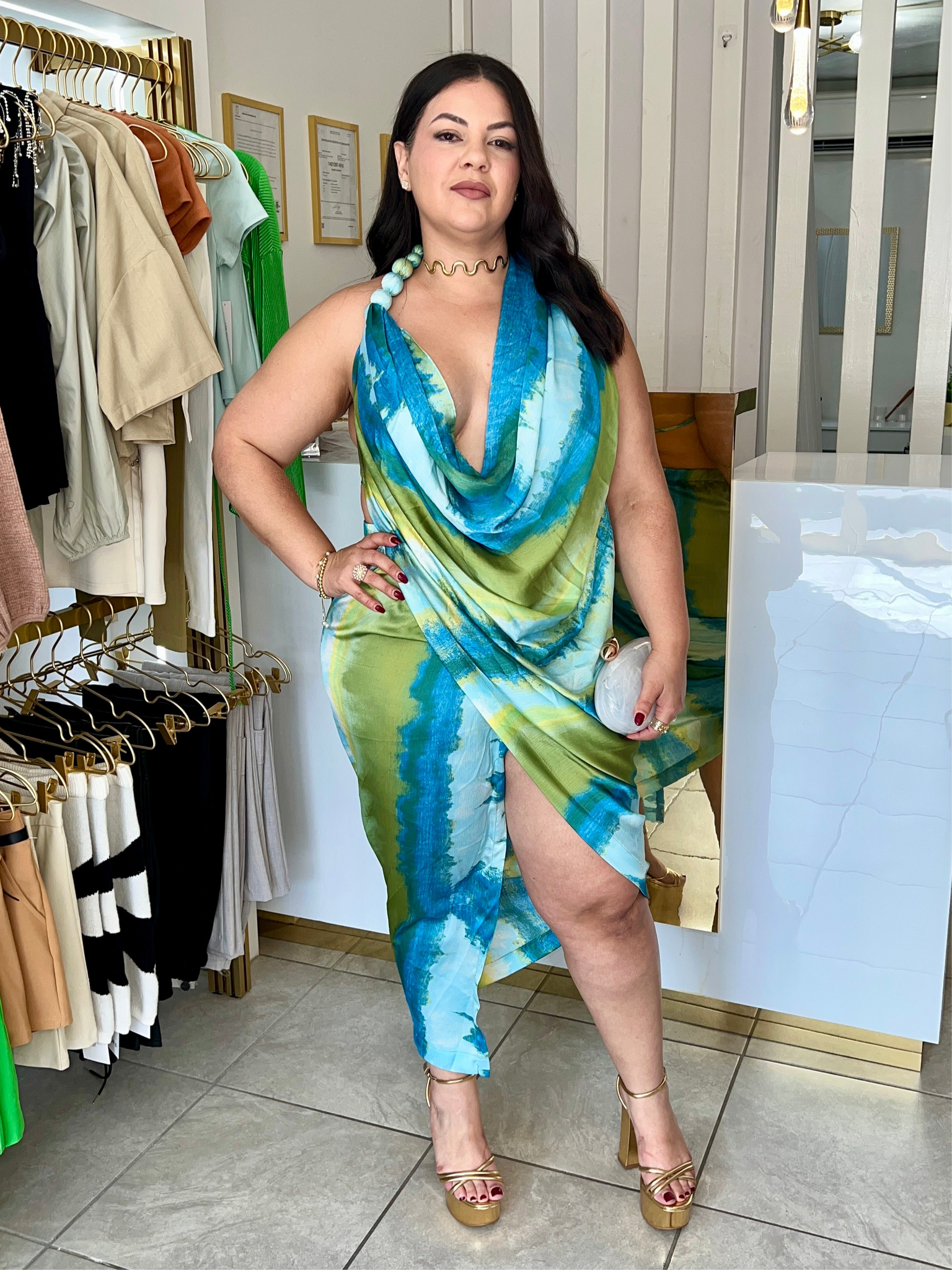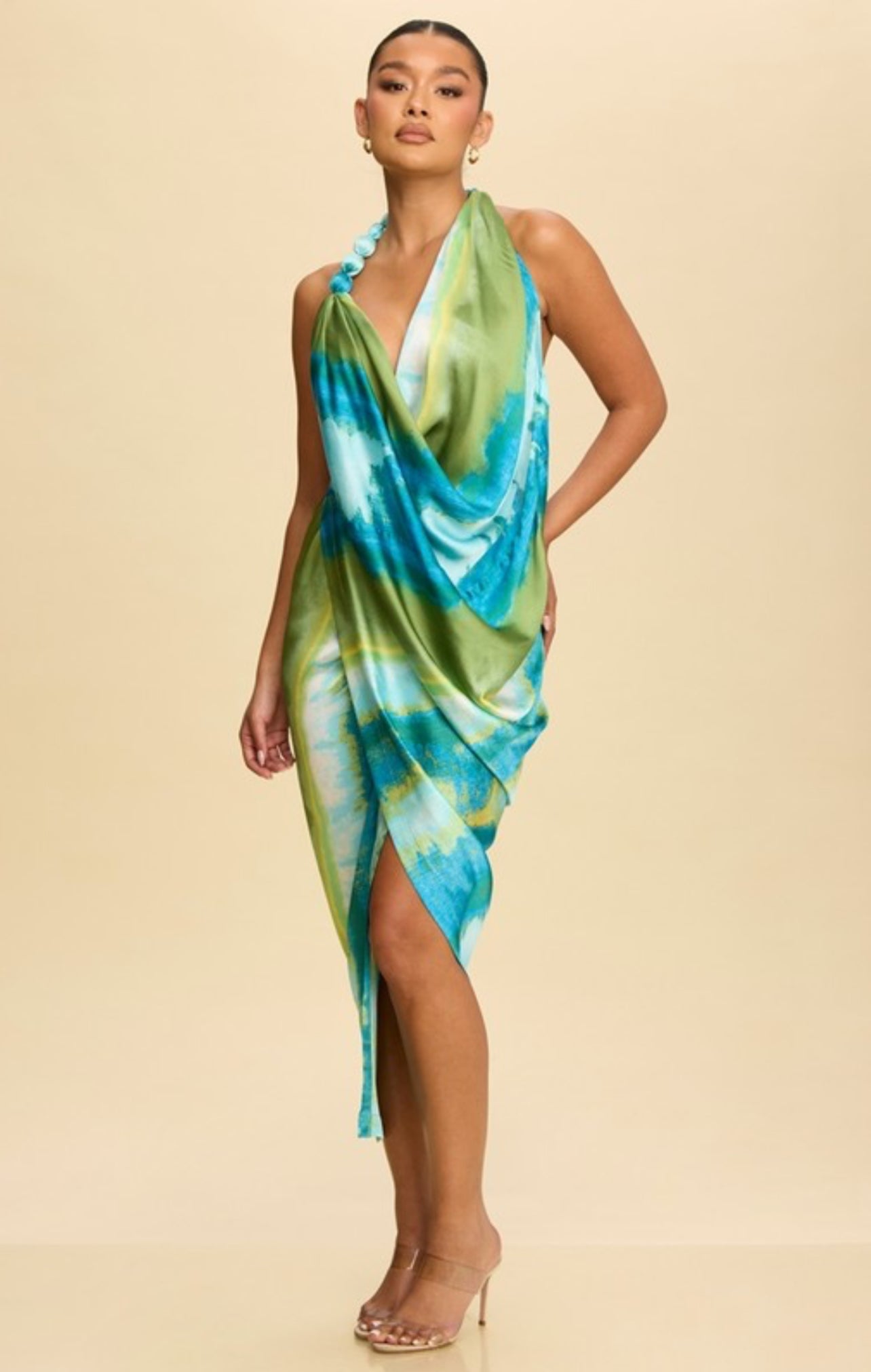 Introducing the Los Cabos Dress, your ultimate summer statement piece. This beautiful midi length dress features a mesmerizing tie dye print and a delicate cowl accent detail on the neckline. The elastic waist ensures a comfortable and flattering fit, while the satin blend adds a luxurious touch. Perfect for any yatch day, summer vacation dinner or even a cocktail party. This a must for your summer wardrobe.
