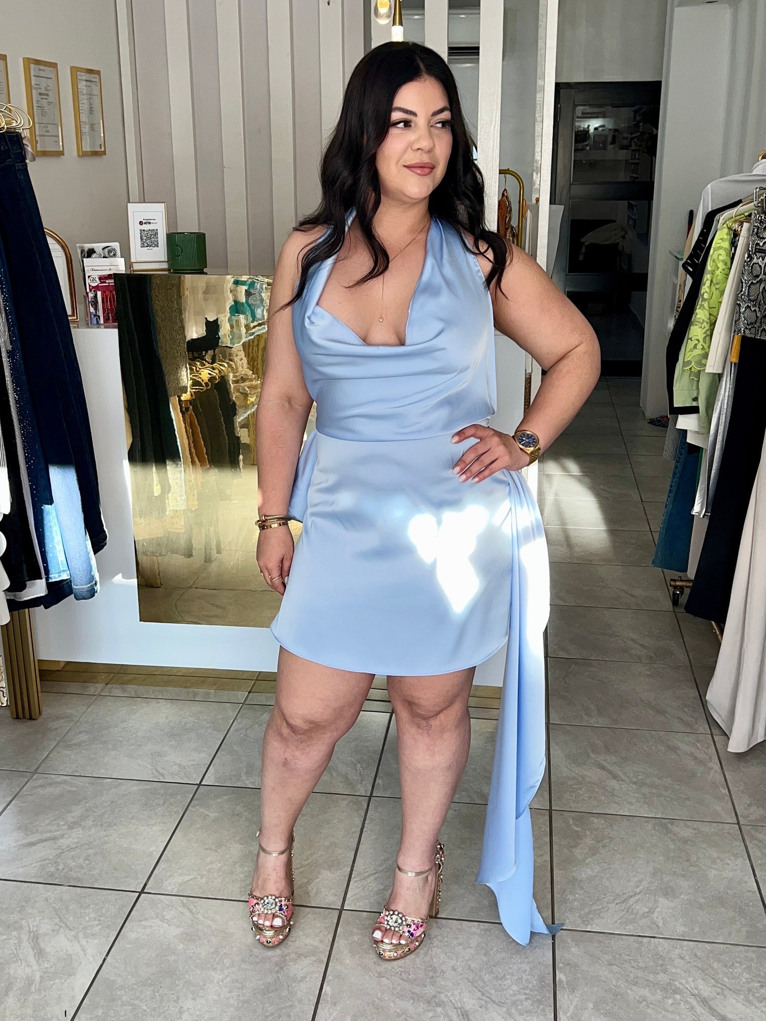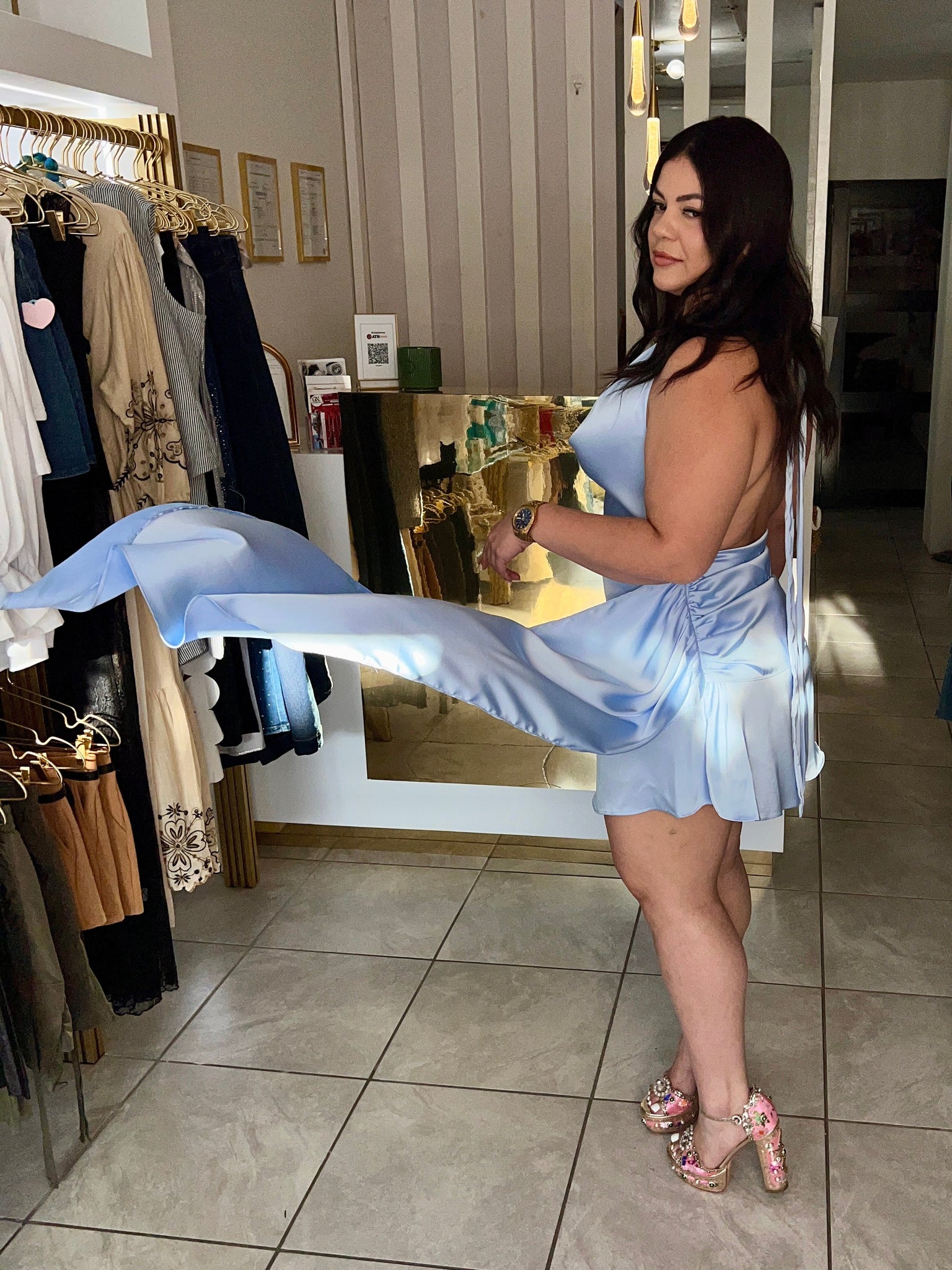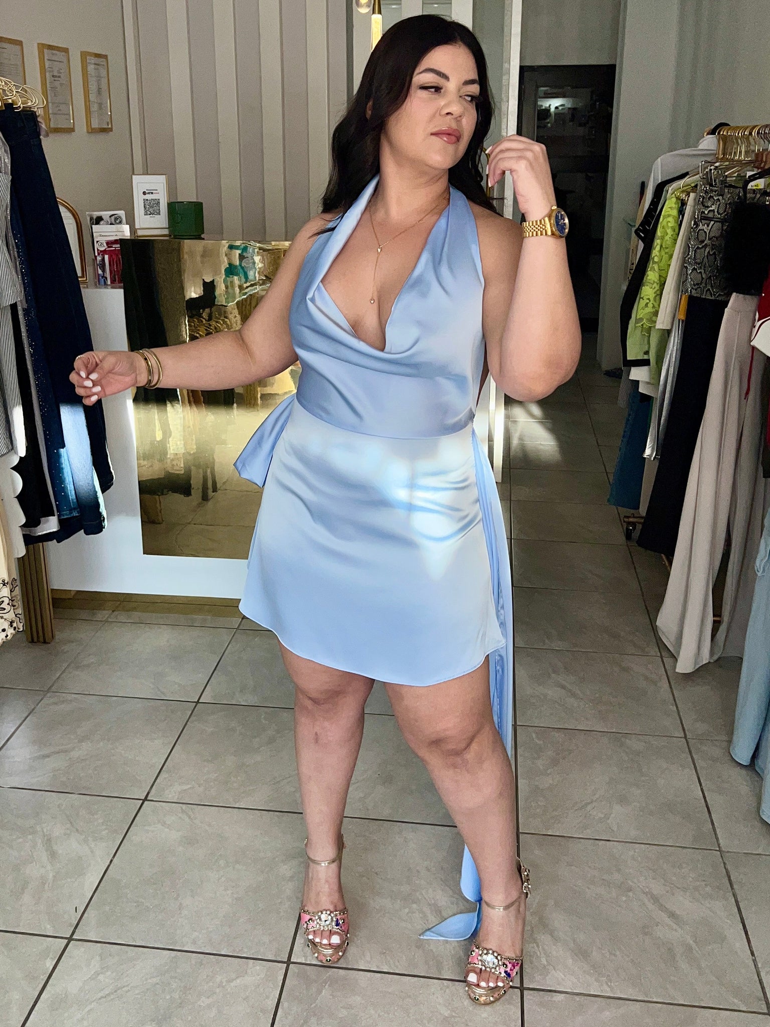 Slip into the Heaven Dress and prepare for compliments to rain down like confetti! This dreamy satin baby blue number features a chic halter cowl neck and a backless drape that’ll have you feeling like the star of your own romantic comedy (minus the awkward moments!). Perfect for date nights or girls' nights out—just add confidence and maybe a cocktail!