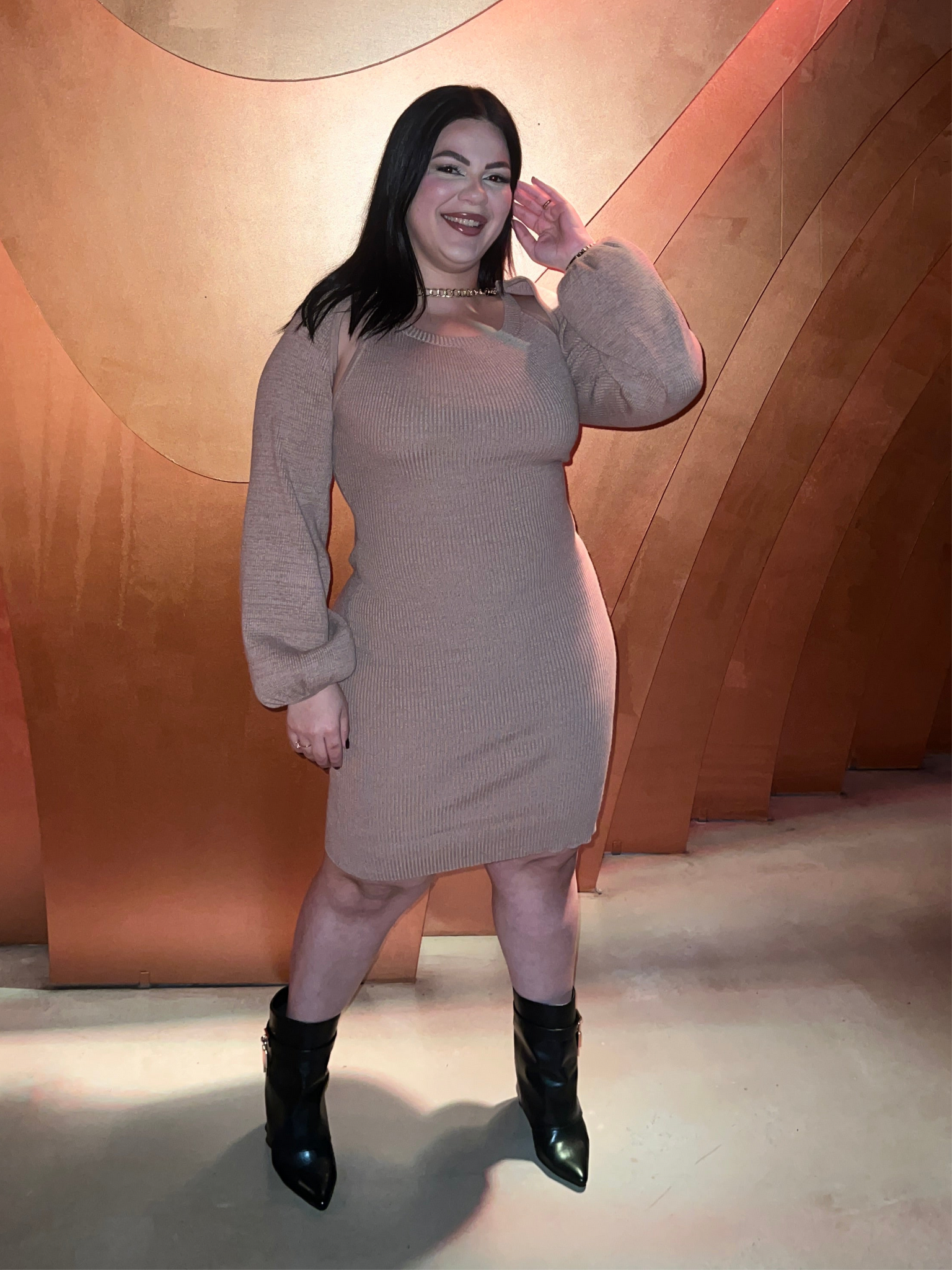 This set features a stylish bubble sleeves shrug and tank midi dress, both in a mocha ribbed knit material. The shrug boasts a unique chain link detail for added flair. Elevate your wardrobe with this fashion-forward set.