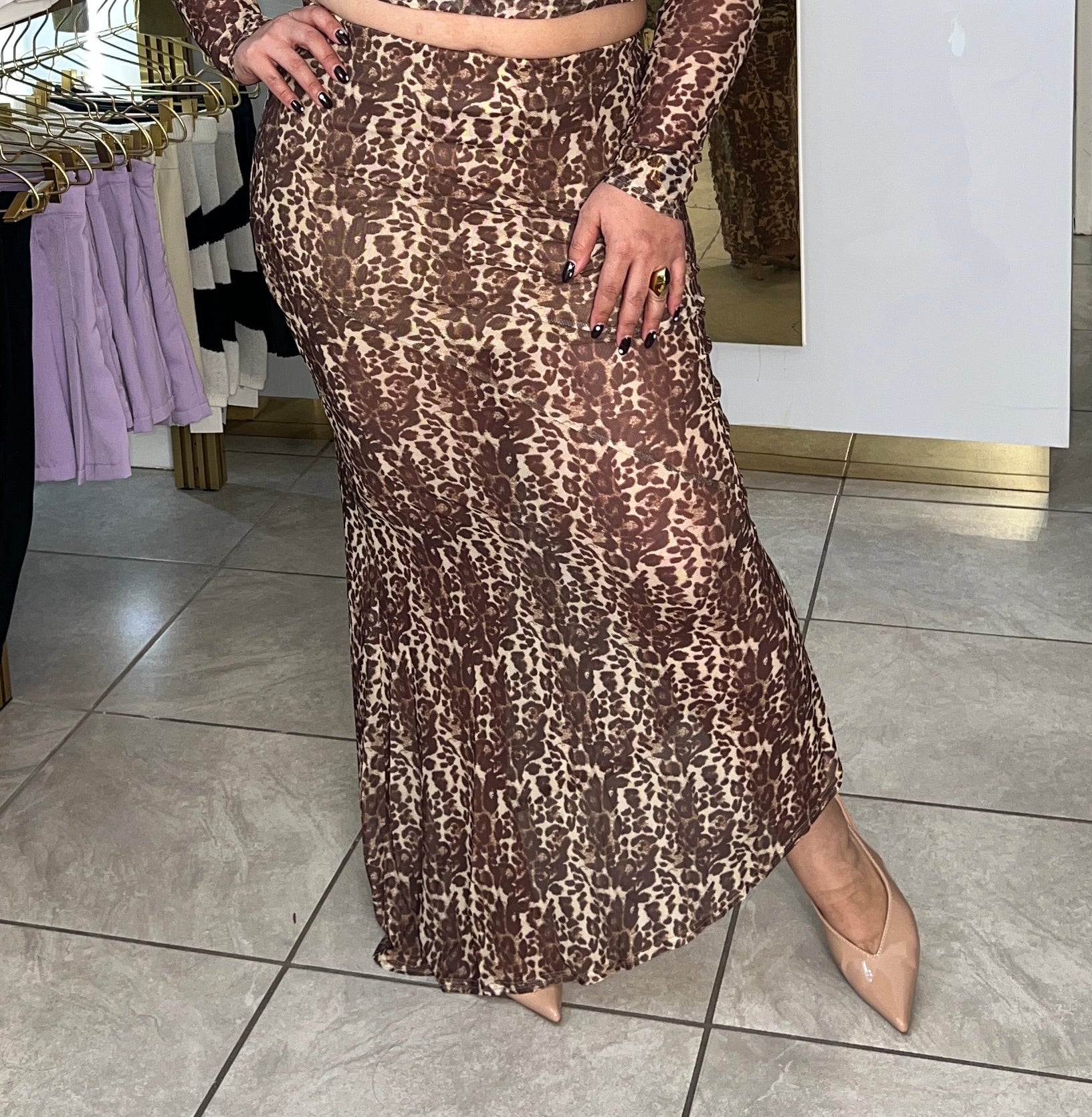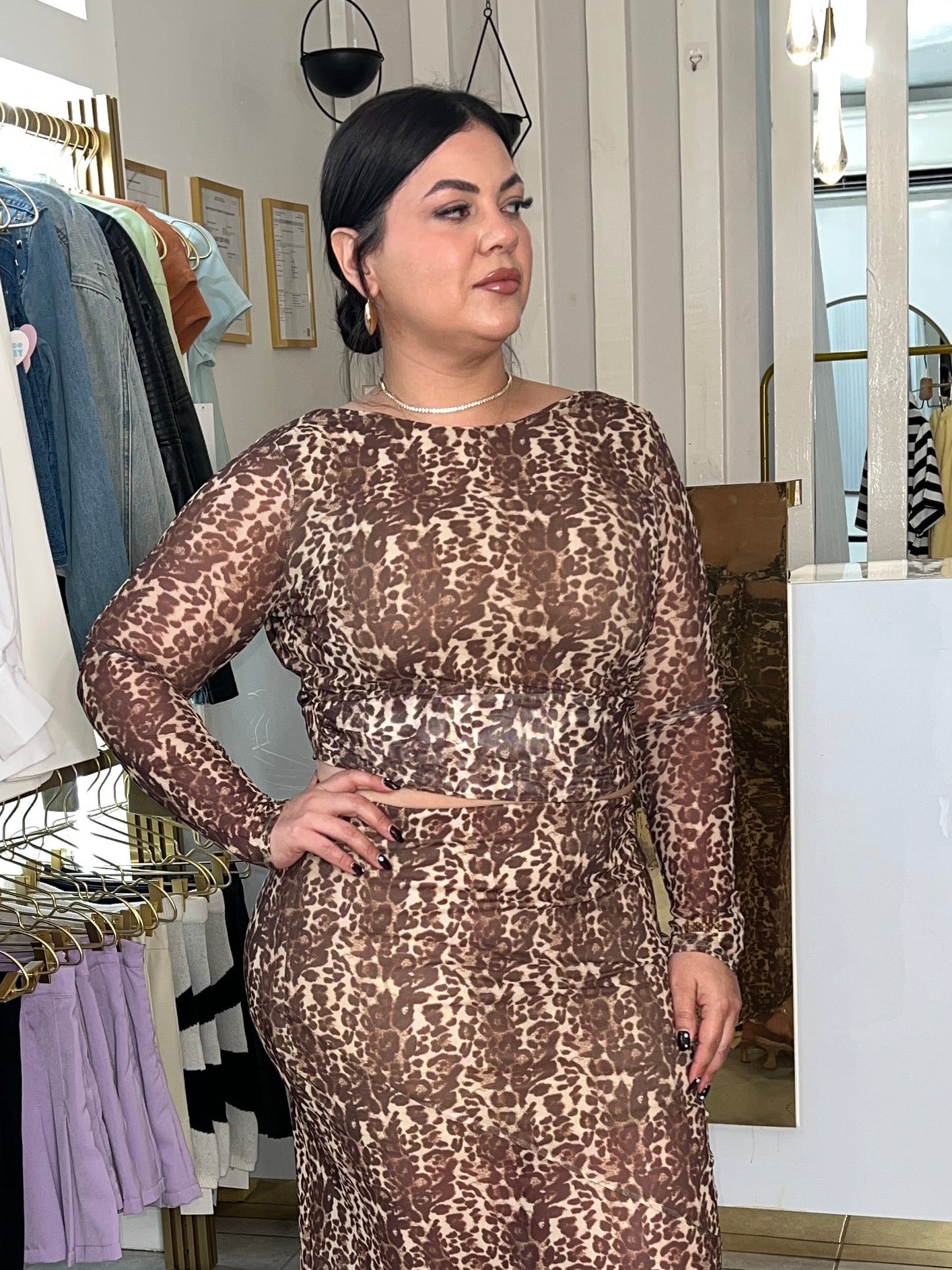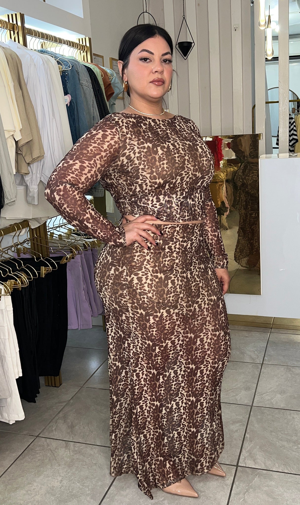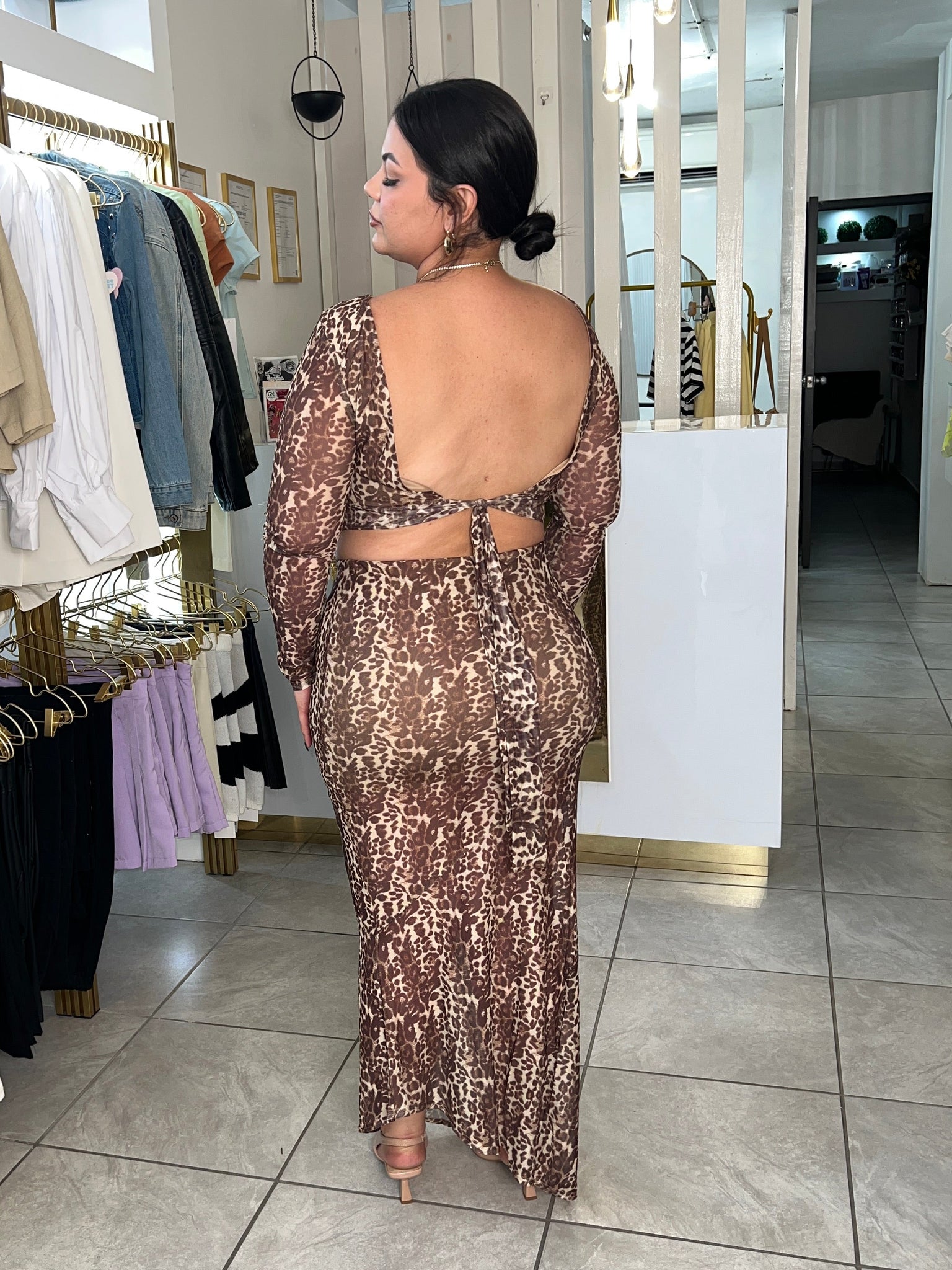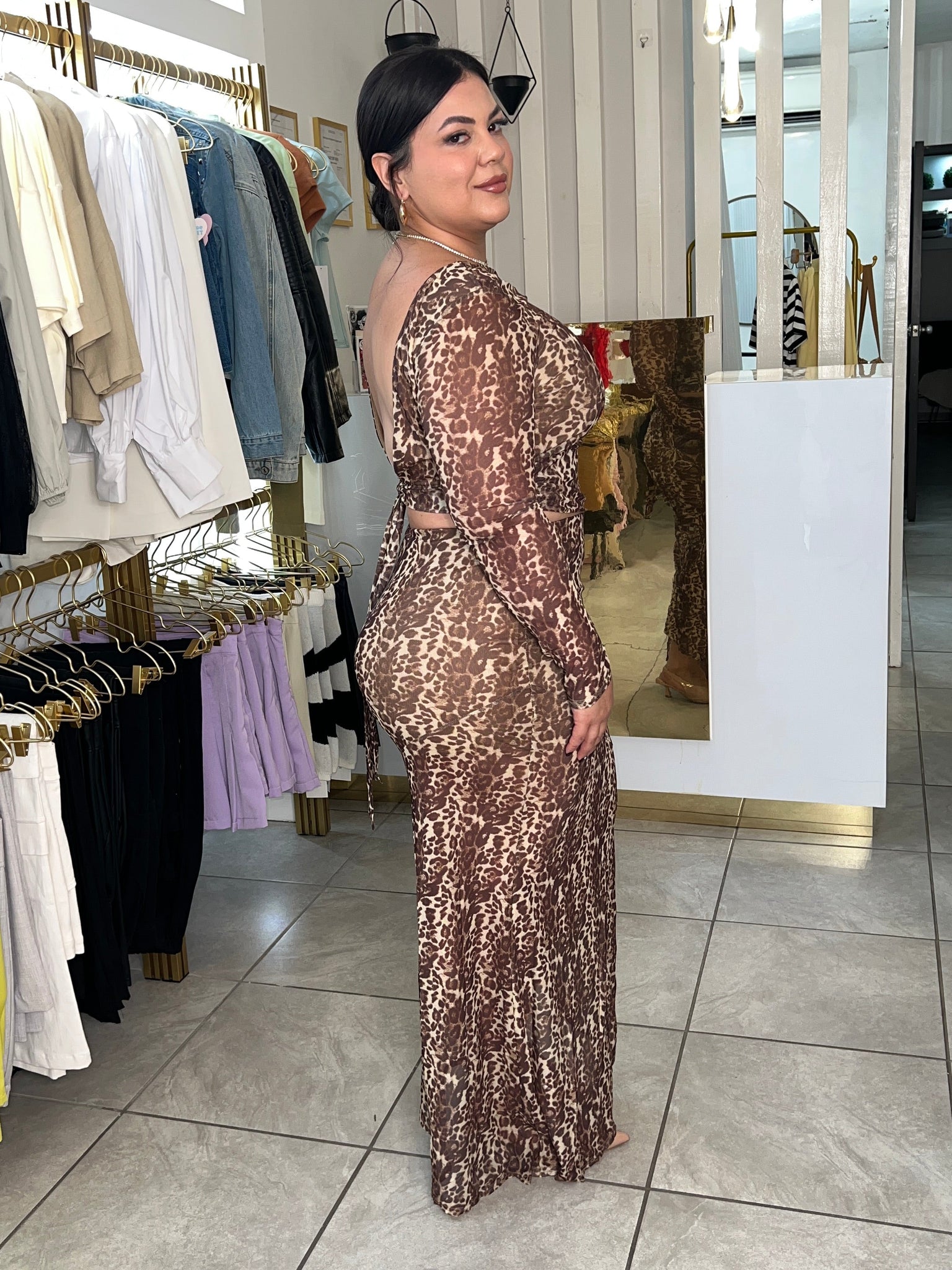 Turn heads with this stunning animal print mesh set — the perfect mix of fierce and feminine. The long-sleeve top features a soft lining at the bust for comfortable coverage, a chic open-back design, and adjustable waist ties that accentuate your figure. Crafted from lightweight, breathable mesh fabric, this set is both sultry and stylish — ideal for a night out or a bold daytime look.